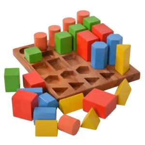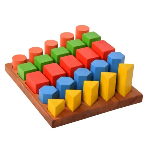 Montessori duyu materyallerinden Ahşap prizmatik farklı boyutlar içeriğinde bir adet oyulmuş çalışma tablası ,beş adet ritmik artan farklı boyutlarda üçgen prizma, beş adet ritmik artan farklı boyutlarda kare prizma, beş adet ritmik artan farklı boyutlarda dikdörtgen prizma, beş adet ritmik artan farklı boyutlarda silindir, beş adet ritmik artan farklı boyutlarda altıgen prizma yer alır. Her bir şekil grubu farklı renk ile renklendirilmiştir.