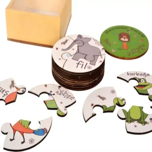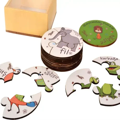 Hayvanlar temalı üçlü puzzle set içeriğinde ahşap kare kutu içinde eğlenceli hayvan görselleri baskılı ,her biri üç parçadan oluşan 12 adet puzzle yer almaktadır.