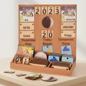 - Görsel ve Dokunsal Öğrenme: Doğal ahşap malzemeden üretilen, el ile tutulup hareket ettirilebilen bu takvim, dokunsal (kinestetik) öğrenmeyi destekler ve ince motor becerilerinin gelişimine yardımcı olur.
